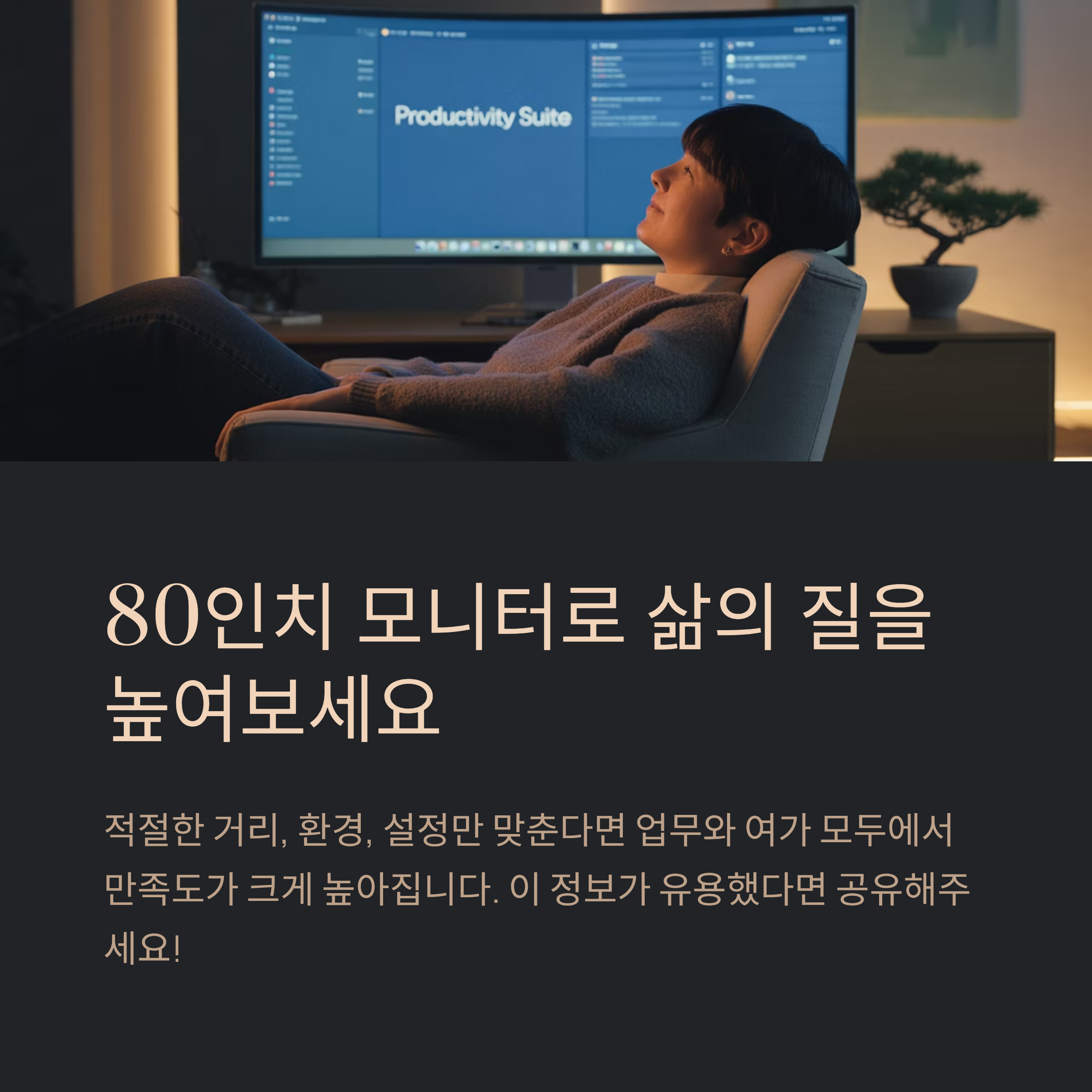 대형 화면은 단순히 ‘크다’에서 끝나지 않고, 그 크기를 어떻게 활용하느냐에 따라 완전히 다른 경험을 줍니다. 적절한 거리, 환경, 설정만 맞춘다면, 업무와 여가 모두에서 만족도를 크게 높일 수 있어요. 오늘 정리한 팁을 참고해, 여러분만의 환경에 맞는 최적의 세팅을 완성해 보세요. 그러면 80인치모니터가 주는 몰입감과 편리함을 매일 즐길 수 있을 거예요.