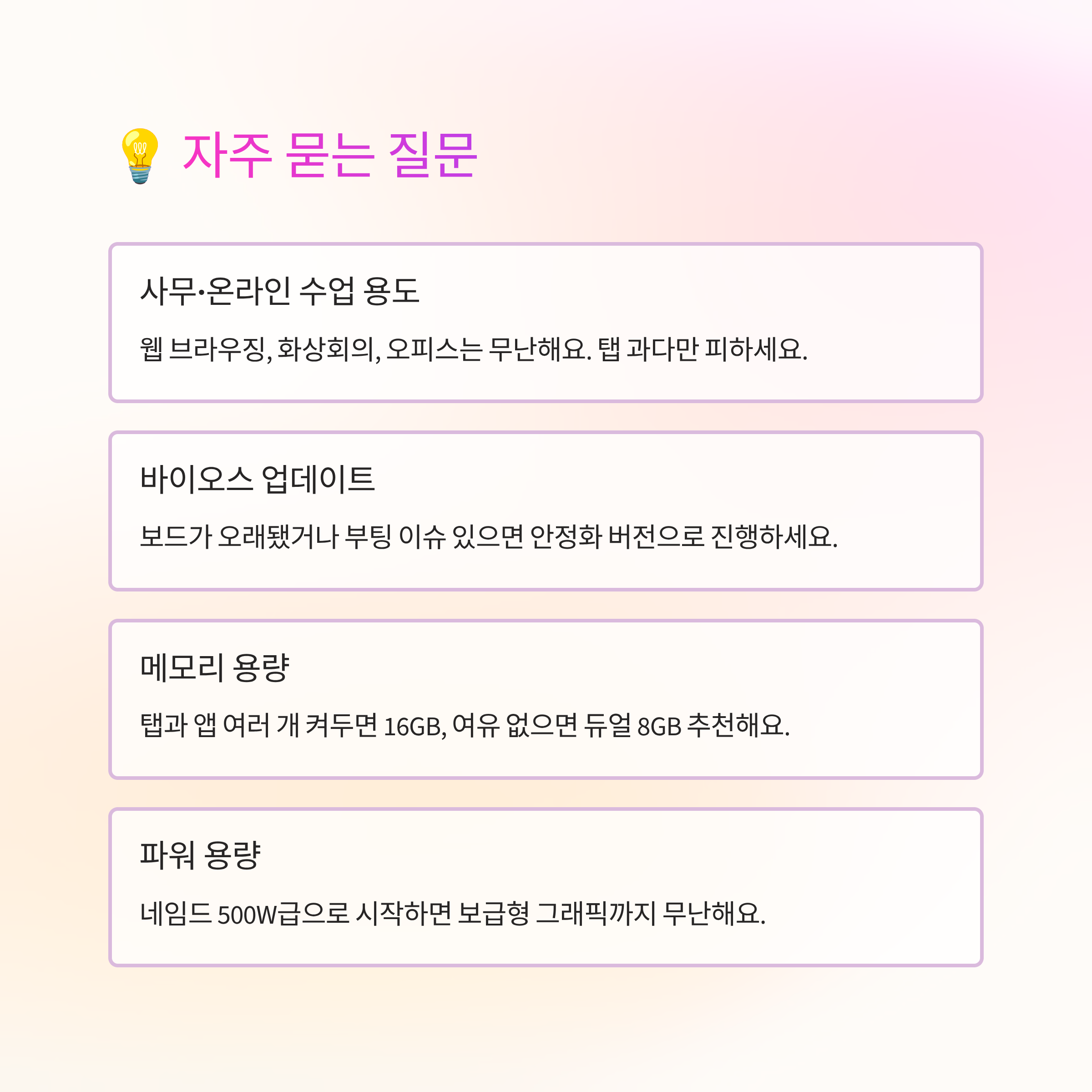반대로 이미 중급 그래픽과 고해상도 모니터를 쓰신다면, 메인 플랫폼 교체가 총비용 대비 더 합리적일 수 있어요. 부품을 일부 매각하고 새 규격으로 넘어가면 확장성에서 여유가 생기거든요. 어느 쪽이든 사용 패턴을 냉정하게 적어보면 답이 금방 보여요.