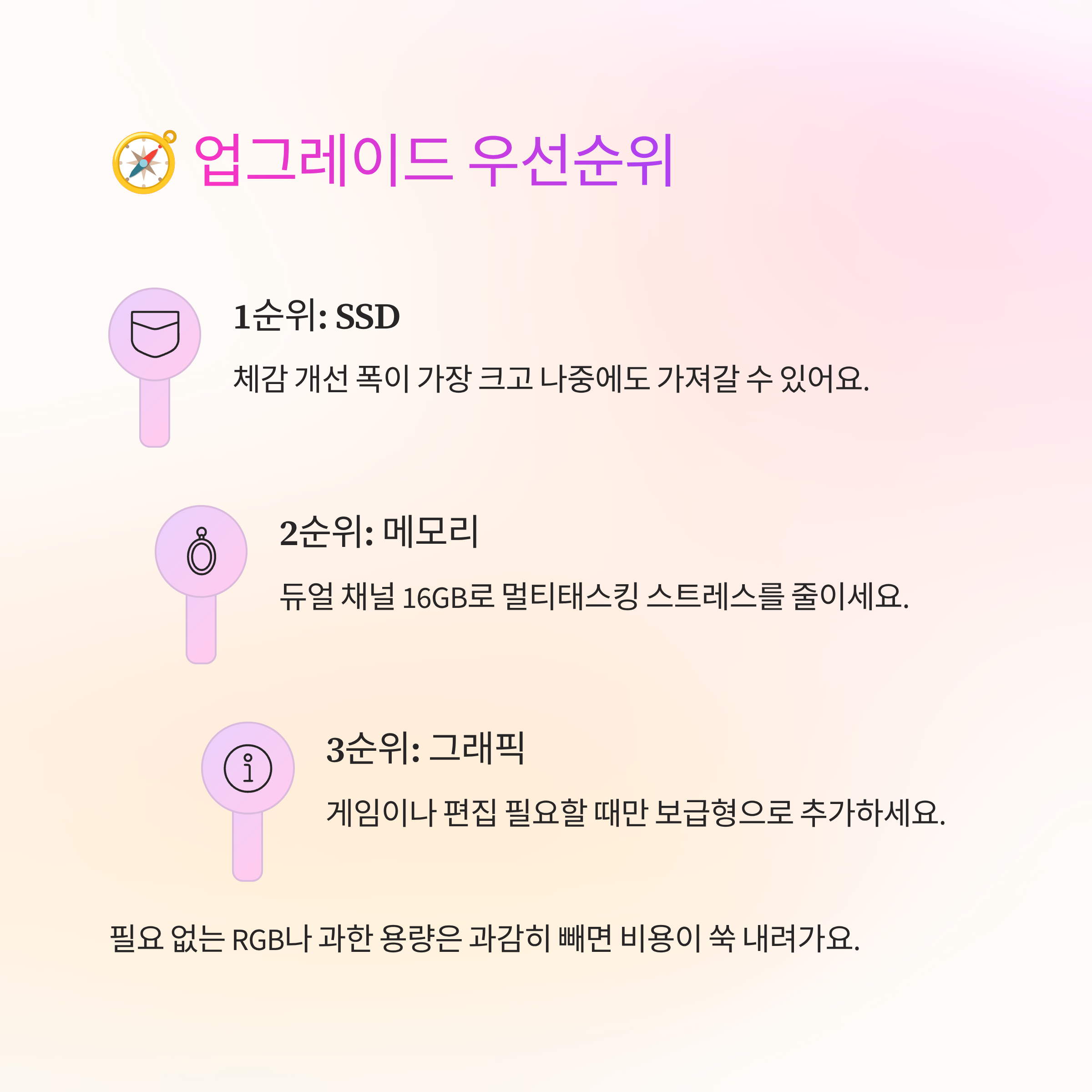 예산이 제한적이라면 첫 번째는 SSD, 두 번째는 메모리, 세 번째가 그래픽 카드 순서로 접근하면 실패가 적어요. 이 순서는 체감 개선 폭이 큰 순서이기도 해서, 같은 돈을 써도 만족도가 다르게 나오더라고요. 필요 없는 RGB나 과한 용량은 과감히 빼면 비용이 쑥 내려가요.