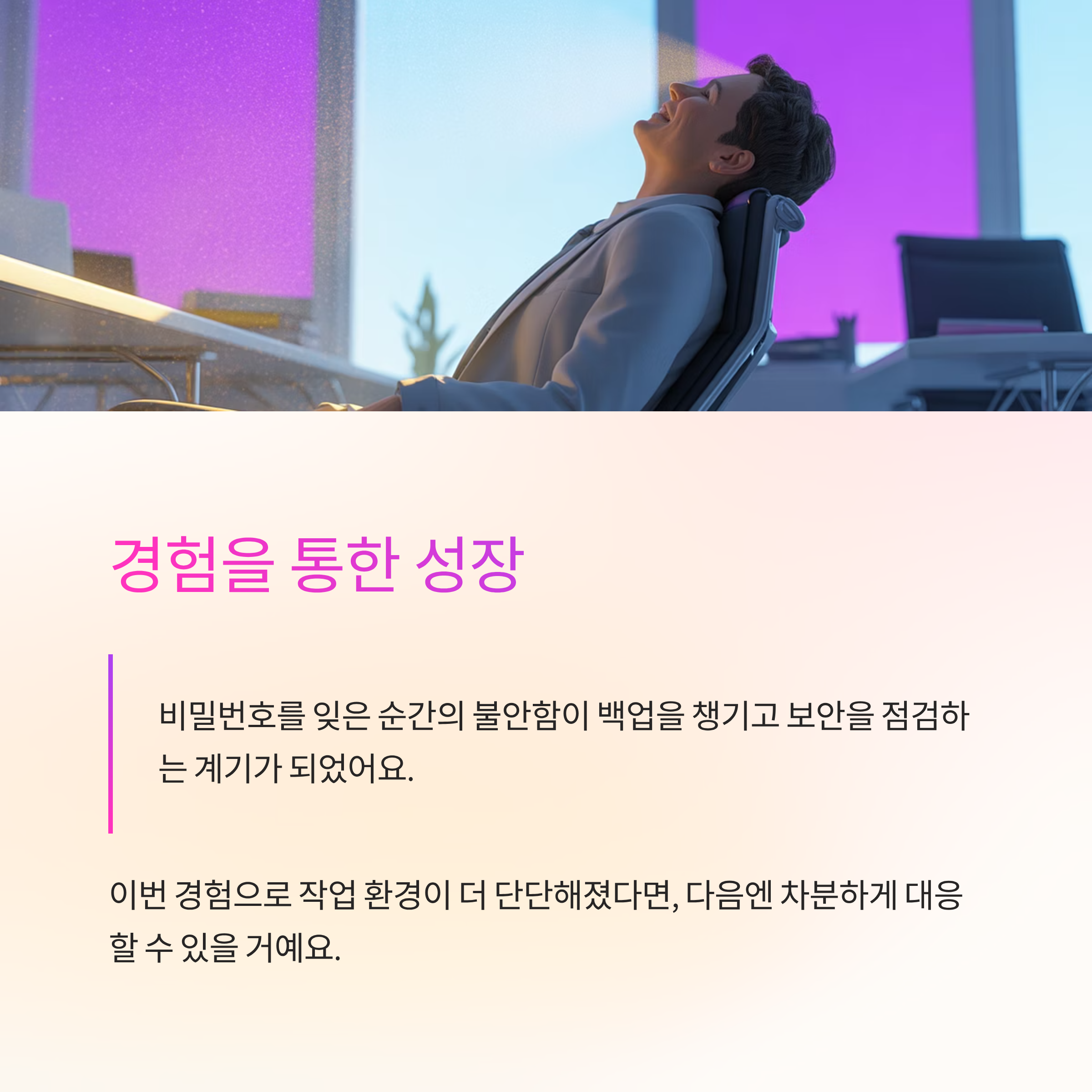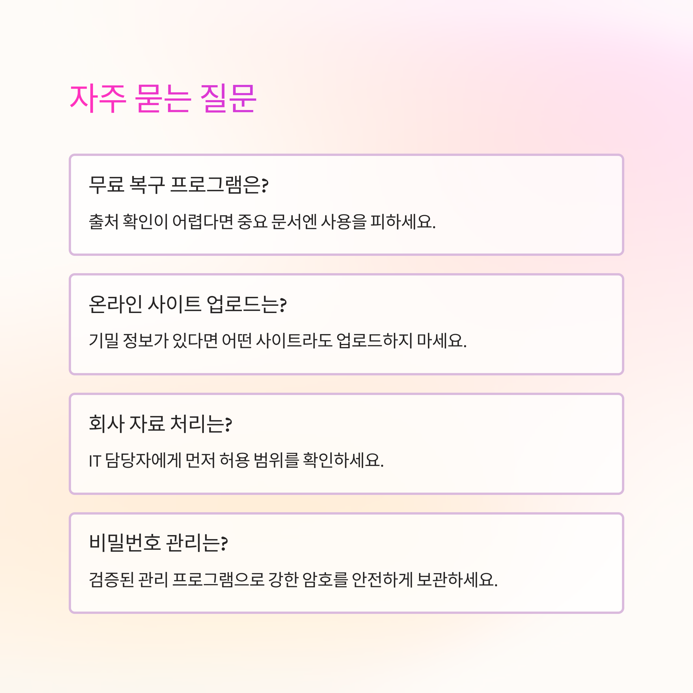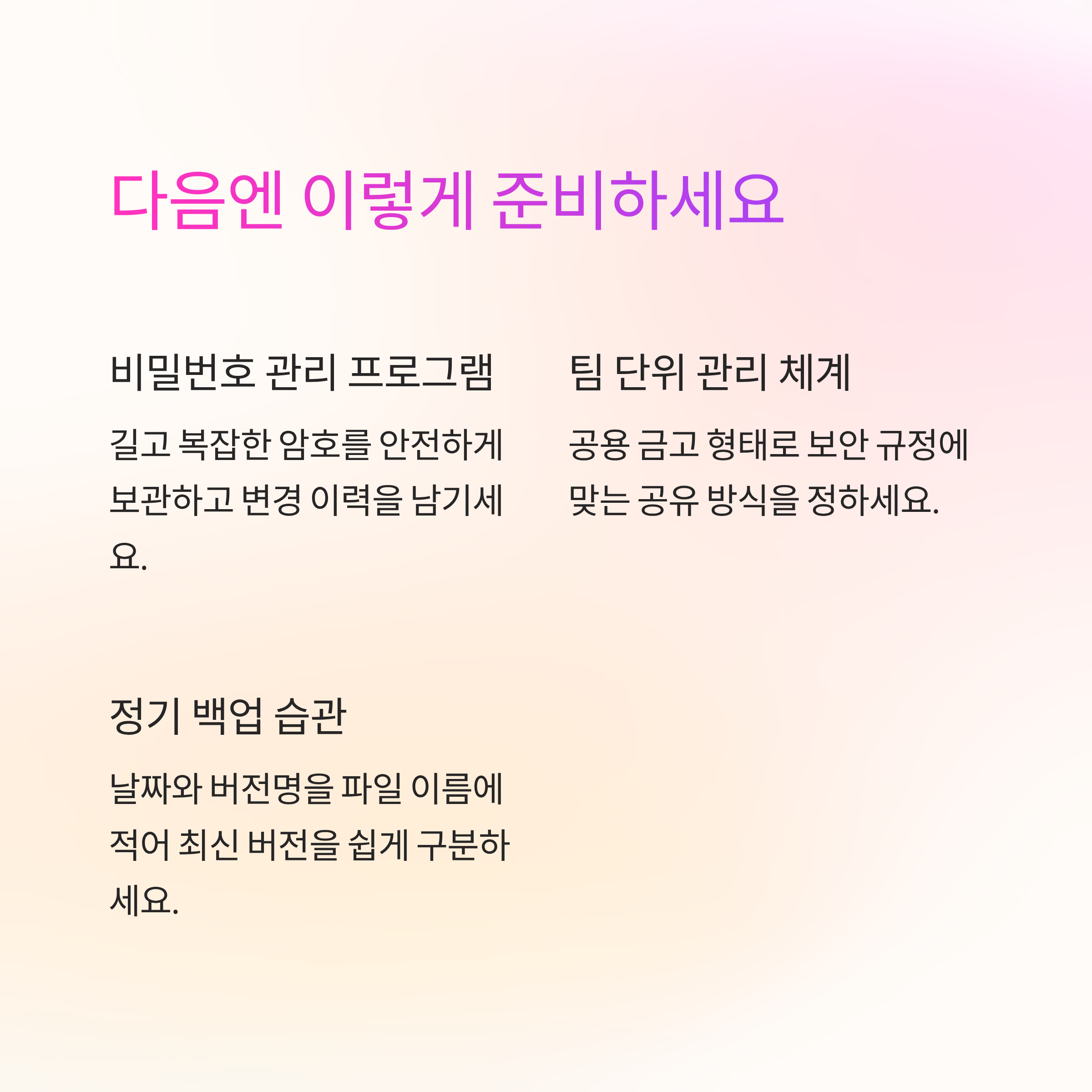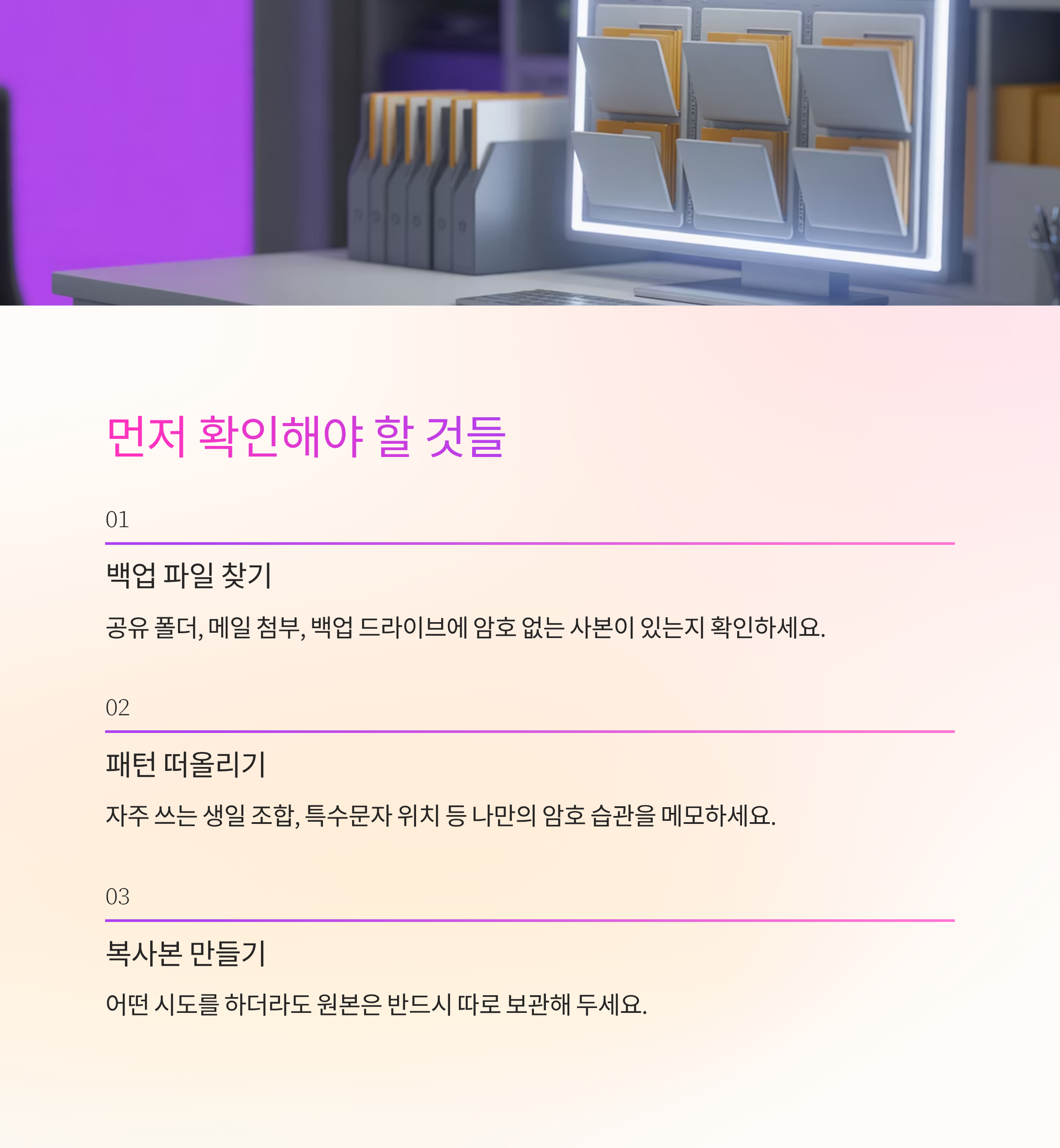 결국 중요한 건 파일 하나를 살려내는 것에서 끝내지 않고, 앞으로 비슷한 위험이 다시 생기지 않도록 생활 습관과 업무 방식까지 함께 돌아보는 거예요. 처음에는 조금 번거롭게 느껴져도, 한 번 자리를 잡고 나면 이후에는 자연스럽게 굴러가서 오히려 더 편안한 상태가 유지되더라고요.